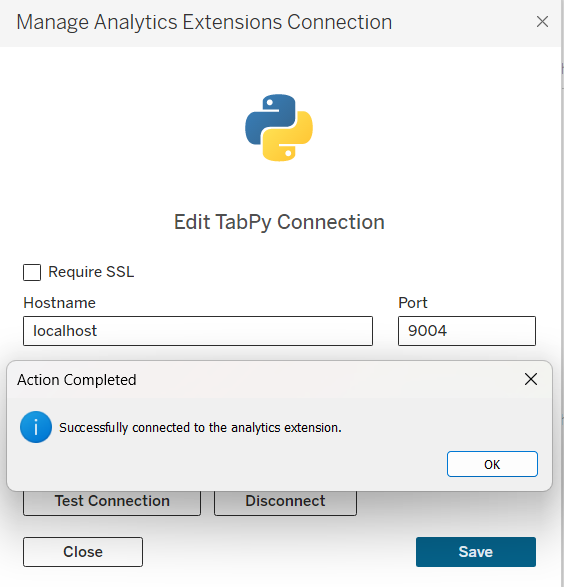 Now, open Tableau Desktop and connect to the sample Superstore data source. Then, go to Help > Settings and Performance > Manage Analytics Extensions Connection. Fill in the Hostname and Port number. If you are running on your local computer, the Hostname is localhost and the port is 9004.