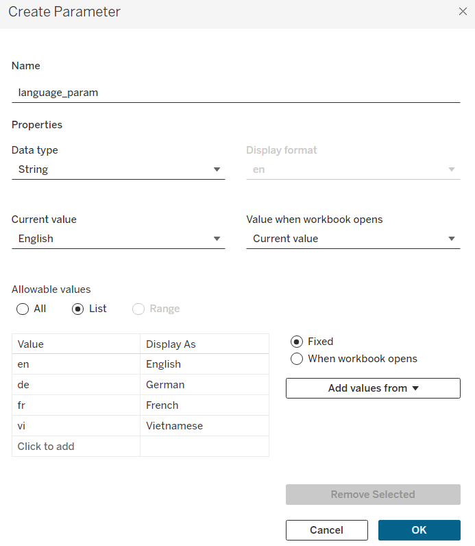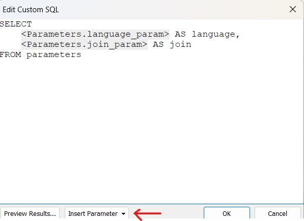 You can insert the parameter from the drop-down menu at the bottom. There are 2 fields for this table (language and join_field). Then, click on OK. It will show an error message. But this is ok, as we will set up the relationship next.