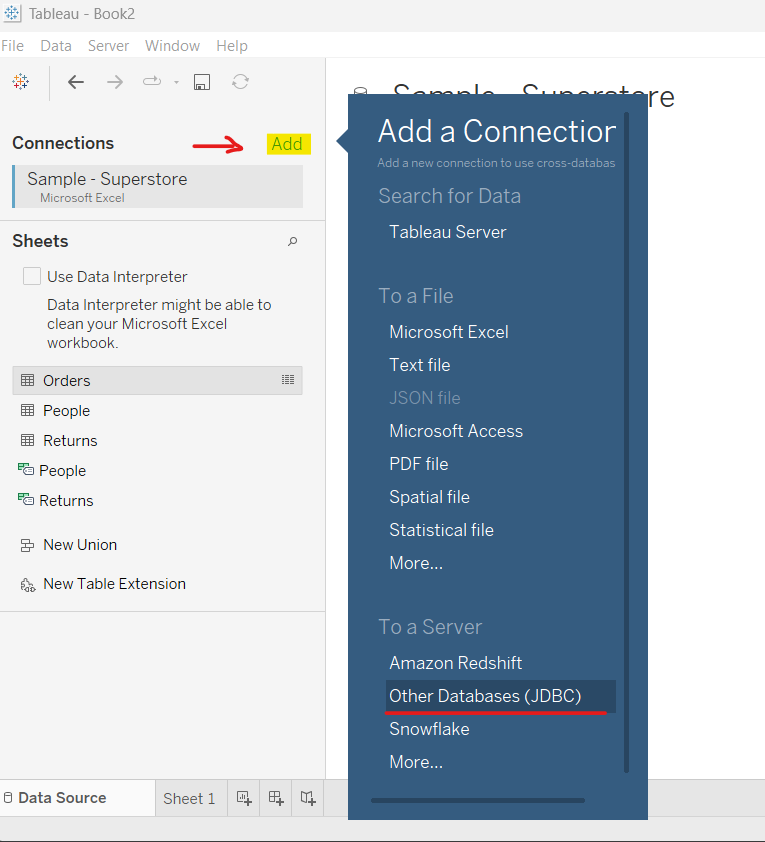Now, go back to the Data Source pane. Then, select the Add button to add another connection and choose Other Databases (JDBC). This will help us add the duckdb database that we created from the Python script above.