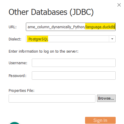 Make sure that you enter the correct directory for the language.duckdb database. Note that the forward slash is "/". In Dialect, choose PostgreSQL. Then, click on the Sign In button.