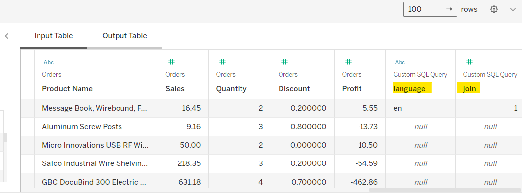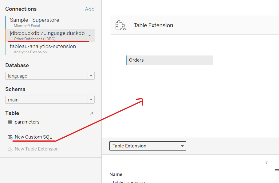 Then, drag and drop New Custom SQL in the Table area to the canvas (same place as the Orders table). This SQL table will connect with Orders. It will help add the language code and the join field (integer 1) to the data frame later.