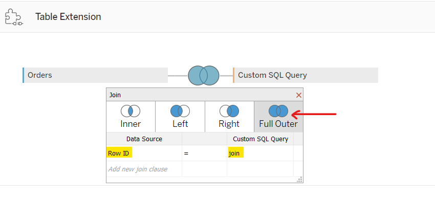 Click on the join symbol, then choose Full Outer. We will do a cross join of 2 tables. In Data Source, I chose Row ID. In Custom SQL Query, I chose join.