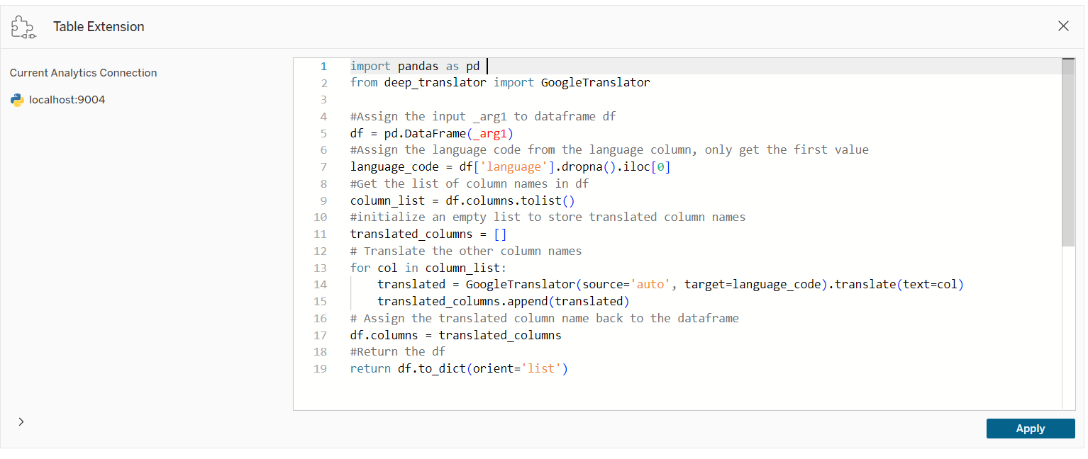 Now, we have the idea of how the Python script works to translate the column name. The Language column would be our parameter to switch the language, as it will change the target parameter in the GoogleTranslator method.