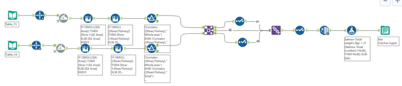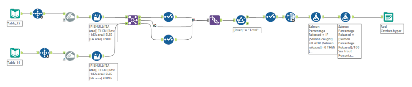 Table 13 and 14 had a similar schema but with different header names so after doing a little bit of cleaning and filtering out unnecessary the rows I joined the two tables together and used a union tool to add back the rows that didn't join. Finally, I used a formula tool to convert the percentages into decimals so that they can formatted within Tableau. The image below shows the workflow for this.