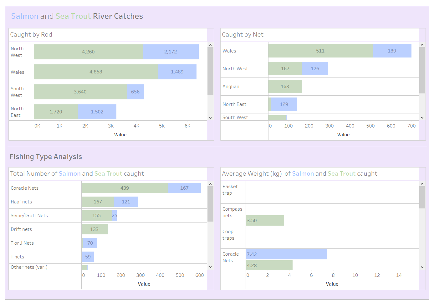 The first two graphs simply compare the overall number of salmon and trout caught by rod against net, and as you can see, rod catches far outnumber net catches. These graphs are also sorted by the region where the most salmon and trout were caught, and you can see that while the North West caught the most salmon and trout by rod, Wales caught the most by net. Both of these charts are drill down charts, so they can be drilled down into by the river.