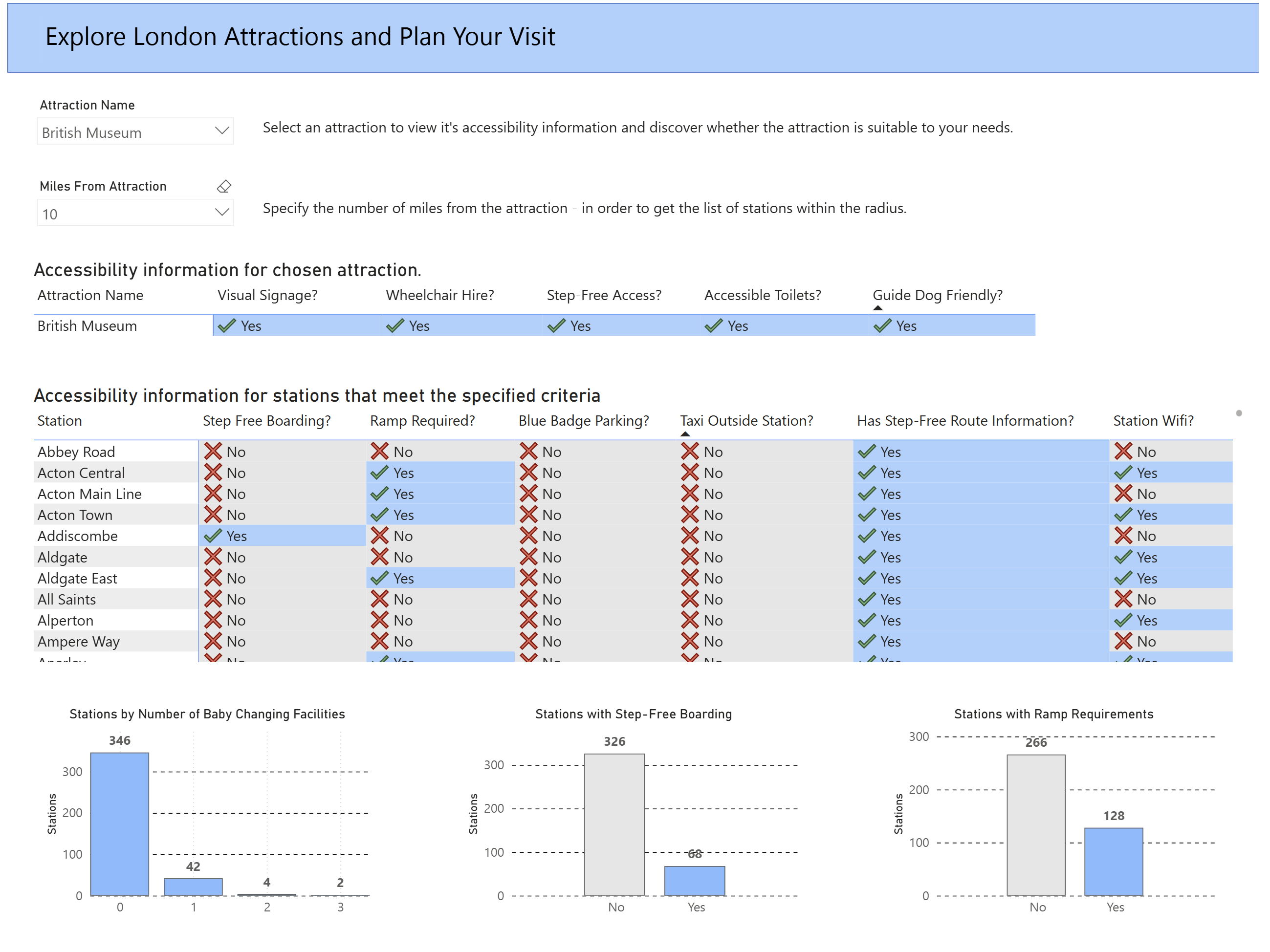 The idea of the dashboard was that they can select a London attraction and view all tube stations within a specified radius, also seeing the tube station's accessibility information (e.g. step-free access).
