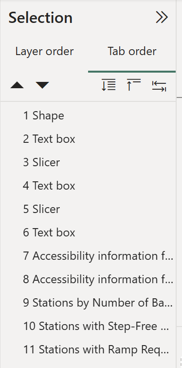 The dashboard also incorporates a tab order. A tab order is for people who only use keyboards and need the tab button to navigate. A tab order specifies what order your selection will go in if you press tab. I configured my tab order so that the user journey is logical - selecting the filters/parameters first and then moving onto the tables / charts.