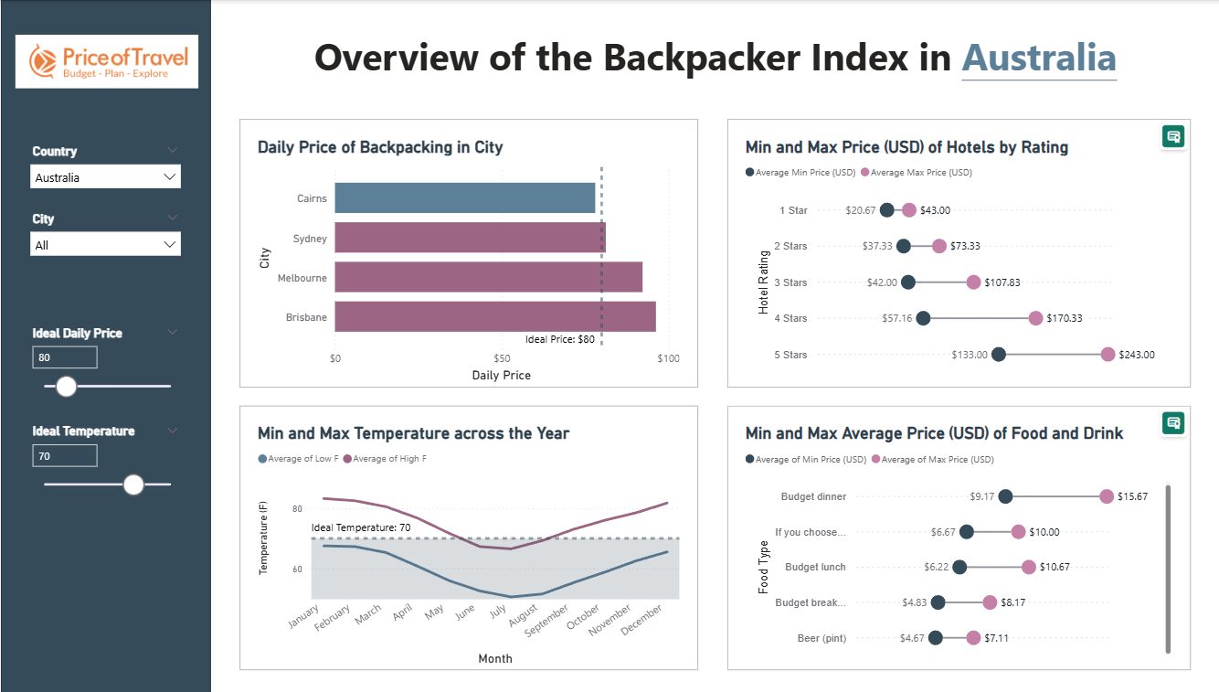 - Use the web-scrapped data to create a PowerBI report that allows budget-conscious travellers to easily compare the prices of different travel costs across countries and cities.