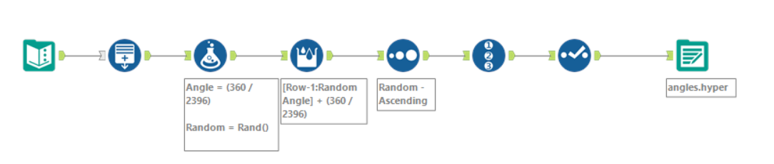 Here is a screenshot of my Alteryx workflow where I created the Angles required for my radial jitter plot (more info coming soon!):