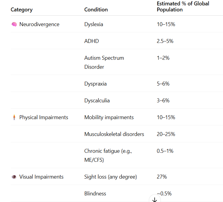 Next I started by trying to narrow down which impairments to include. In order to do this I asked ChatGPT what was the estimated % of those with different impairments. Seeing as the brief specified as many individuals as possible I thought focusing on impairments with a larger percentage would be a good place to start.