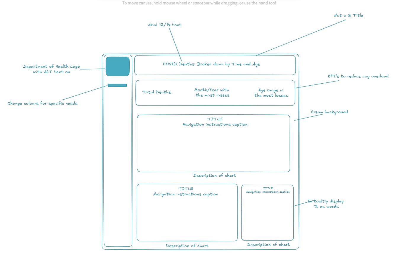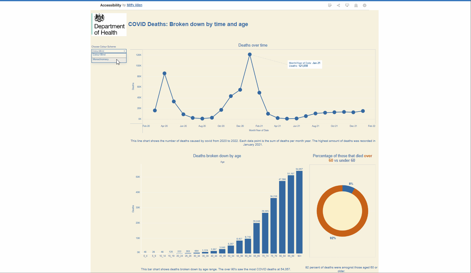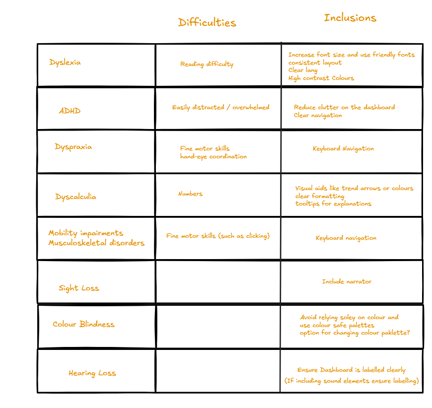 I tried to ensure that a screen reader could be used, that titles were clear and that colours were colour-blind and dyslexic friendly. In the tooltips I also planned to display numbers as words for those with dyscalculia.
