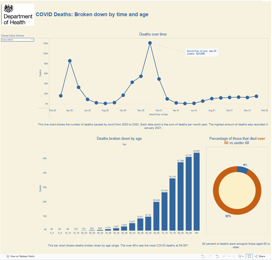 Although I managed my time much better this today, I was still a bit too ambitious with what I wanted to achieve. I didn’t manage to complete the KPI’s and I only included colour-blind friendly and monochromatic friendly options in the toggle option. I also only managed to complete one tooltip to be dyscalculia friendly. Another issue I encountered was spending too long trying to use a screen reader in desktop. Once I had published on tableau public the screen reader started to work but at that point a fair bit of time had been lost.
