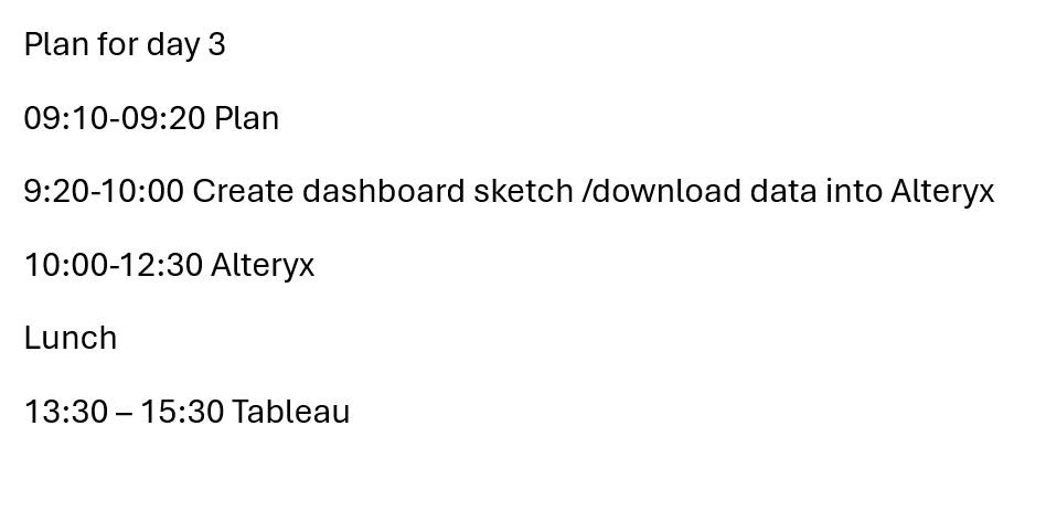 I did manage to keep to this plan pretty well until Lunch where all hell broke loose for 45 mins when it looked like I had deleted my entire Alteryx flow ☹. Thankfully it was recovered!