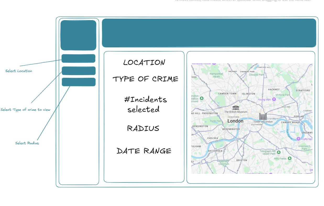 This flow allows the user to select an area, date range, crime type and radius from a location.