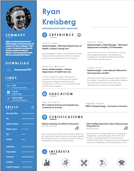 I began the process by searching for inspiration. I really liked this classic CV by Ryan Kreisberg posted on Tableau Public. It has traditional CV elements but elevated with some data visualisation and interactivity.