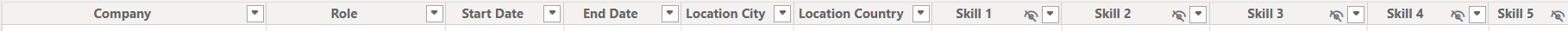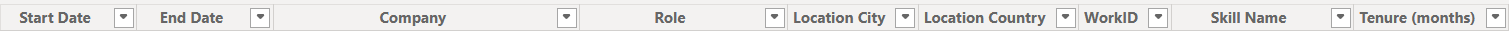 In Power Query, I unpivoted these fields to create a single 'skill' column and calculated the number of months from the start and end dates. This structure would allow me to plot skills against months of experience, automatically summing across different work experiences. I applied the same approach for the 'Tools' used throughout my career.
