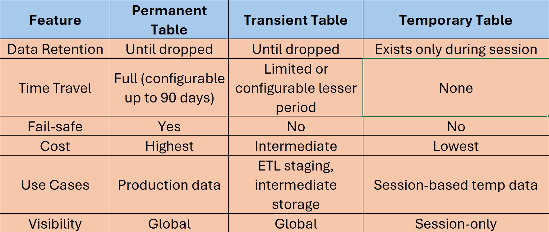 When is a table not a table?Snowflake has three main types of tables in order to accommodate various data storage needs: permanent, transient, and temporary tables. Each table type has different traits that cater to different scenarios. In this blog, we will attempt to summarise each of them and give some scenarios.