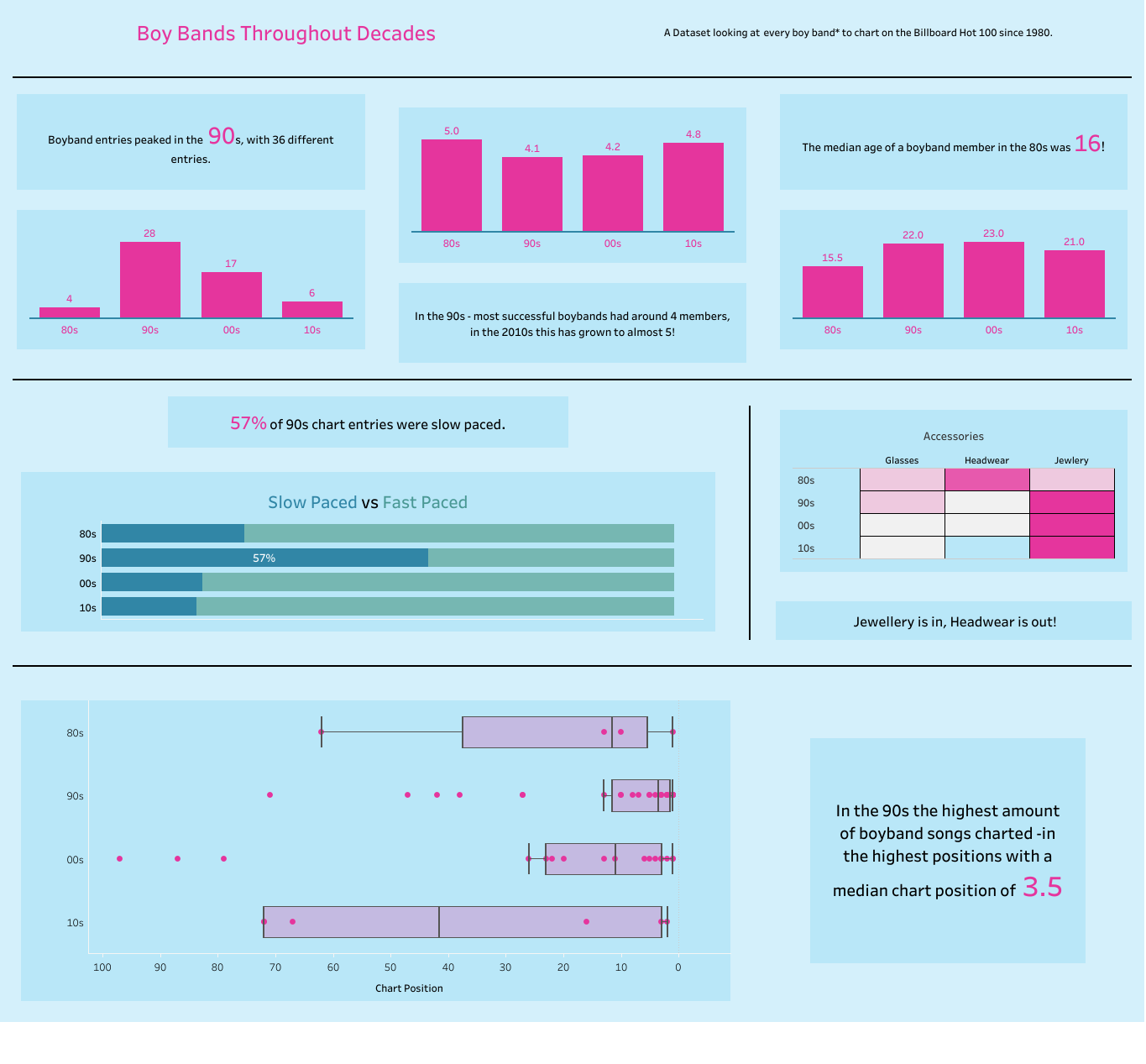 The final day of dashboard week for us involved creating an infographic around a dataset looking at every boy band to chart in the Billboard Top 100 since 1980. Infographics combine data with visual storytelling, making them engaging and informative.