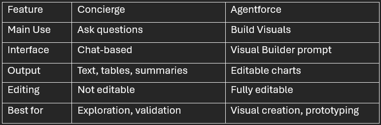 While Agentforce helps you build new visuals, Concierge is about answering questions. Here's a quick comparison: