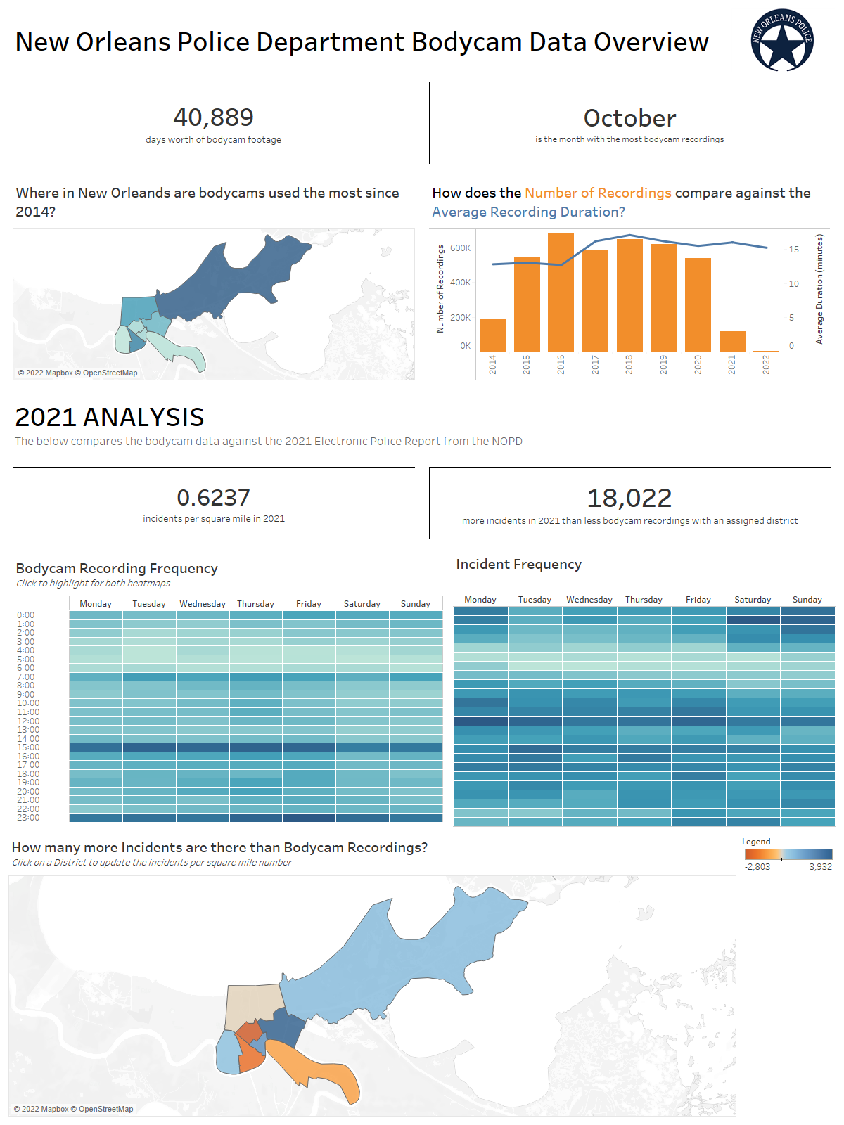 After much playing around with the data and trying new things, I ended up with the below dashboard. My thought process was to have an overview of the bodycam dataset at the top, and then after this do a deep-dive into the 2021 incident data and see how these two compare. Overall it was interesting to see that there are many reported incidents which are still not captured on bodycams and to see which districts have a larger difference between these numbers. This kind of information could be useful for the NOPD to be aware of as it's important to ensure that bodycam footage is captured wherever possible to be used in a court of law and end disputes about an incident that may be ongoing.