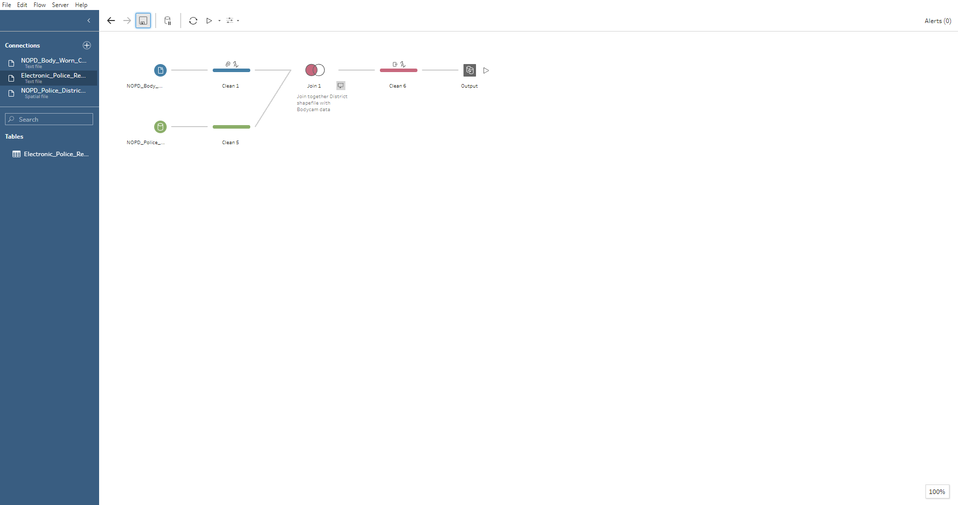 The next step was to start preparing the data. Fortunately the data was already really tidy, so apart from changing a few data types, all that was left to do was to join the spatial file - done with a left join as there were some fields in the bodycam data which were null but I didn't want to exclude these completely. This could have been done in Tableau however I wanted to do it at this early stage so that there would be less to process and I could simply output the file with each record having spatial data attached to it.