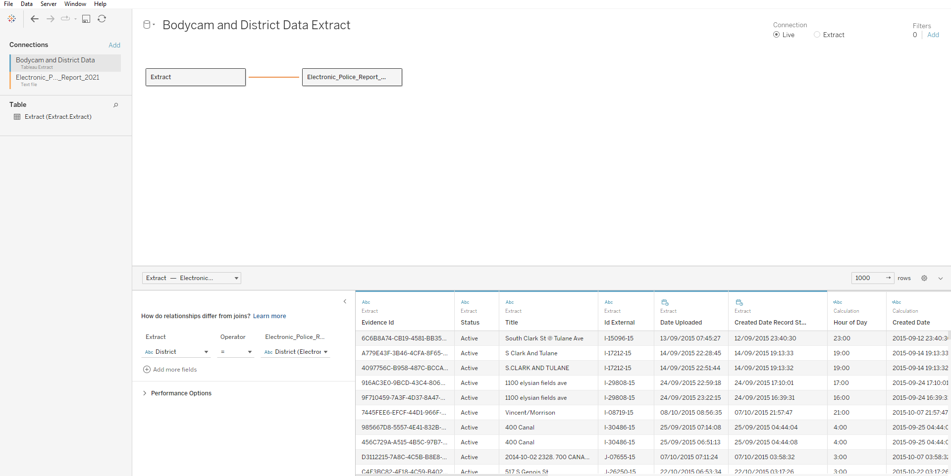 I did instead use a Tableau relationship when bringing in my other police report data for 2021 (as seen below) as this was really easy to do by simply pointing at the 'District' field in each dataset after changing their data type from Number to String.