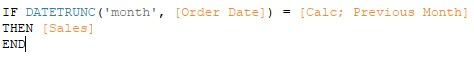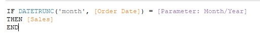 - What it means: If the truncated month and year matches the selection made on the parameter, then display the Sales (or any chosen measure).