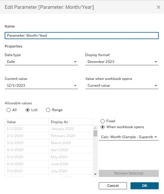 - Allowable Values: Choose "List" so that all dates are listed below, click "When workbook opens," and select your Month/Year Calculation.