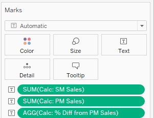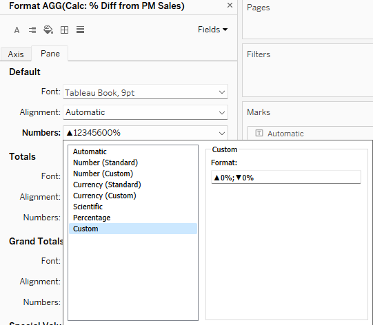 Step 9: Format the % Difference calculation by clicking on the white triangle on the right side of each pill and by choosing "Format."