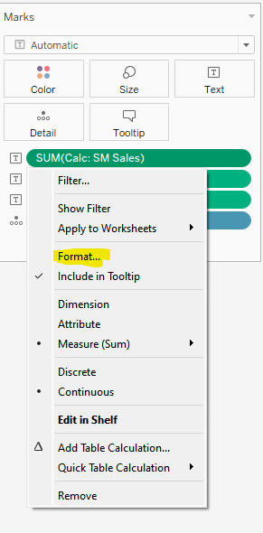 Step 8: Format the selected month and previous month calculations by clicking on the white triangle on the right side of each pill and choosing "Format."