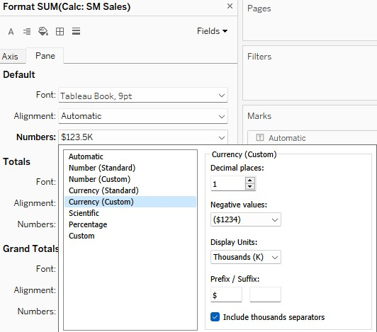 - Choose "Currency (Custom) to include the "$" and "K" with the measure.