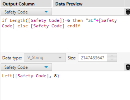 My task was to make it so that if the table above had a safety code which was more than 8 characters remove anything after and anything that was only 6 characters long to add the letters SC at the start. I immediately knew I would have to use the formula tool and write an IF statement but how to word it was the question as I had little to no experience with these formulas. This is where google is your best friend.