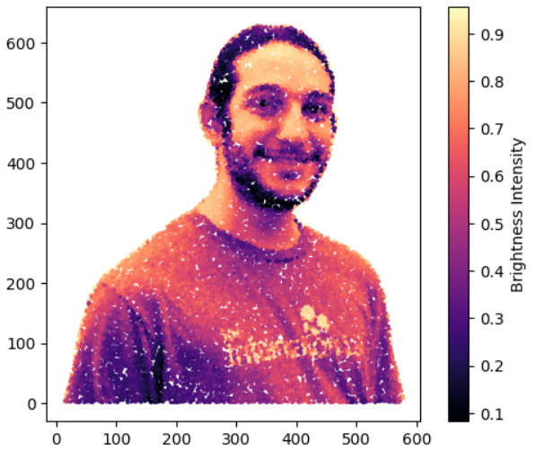 While not as pertinent to quantitative analysis, plotting images as scatterplots offers a delightfully creative output for Tableau. Python's computer vision library can be used to analyze an image and generate a csv with generated x, y, and intensity values.