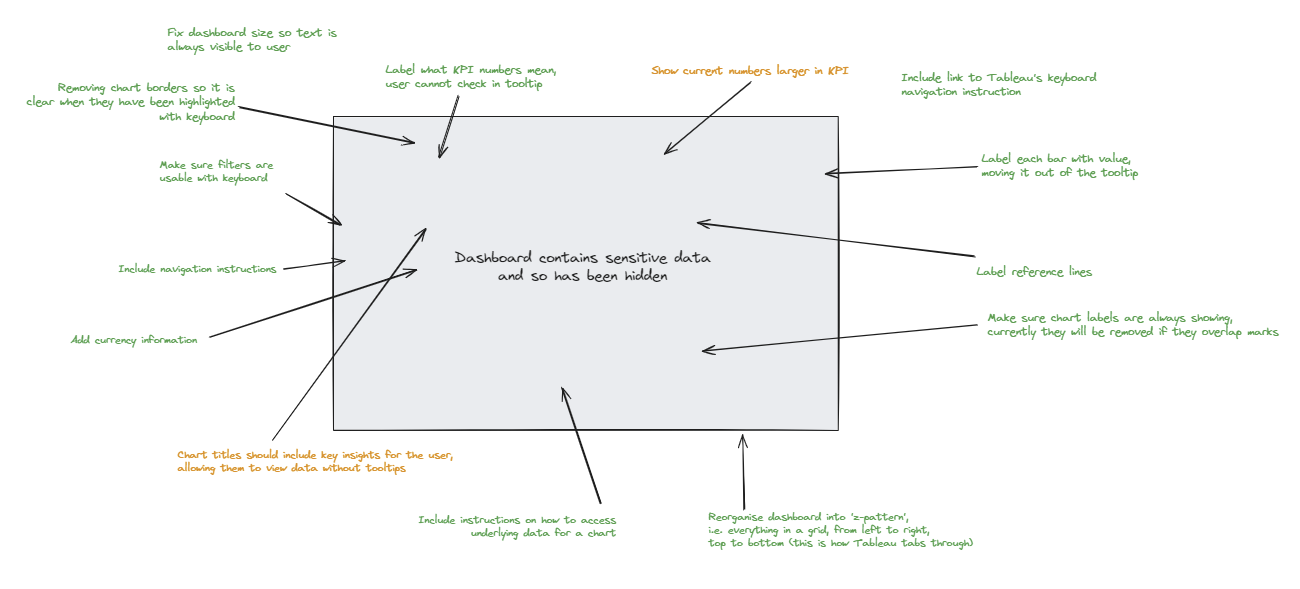To initially plan how I would improve the dashboard I decided to create annotations surrounding, to highlight any notable accessibility issues for keyboard only users that I could improve on. These included things such as rearranging the dashboard, labelling charts with values, labelling reference lines, and adding instructions of how to use the dashboard with only a keyboard. Below I have included a screenshot of my annotations, with the original dashboard hidden. Annotations highlighted in green were those that I successfully addressed in my final dashboard, and those in orange indicate accessbility issues I did not fully address.