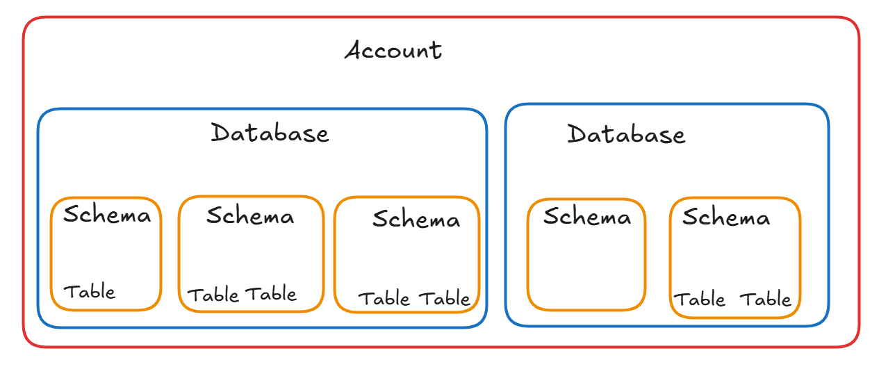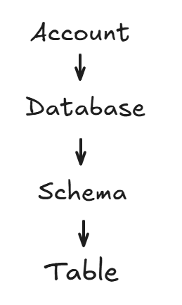 In short, creating a table requires you to define both the database and the schema. If that feels like a lot to track, the diagram below will help illustrate Snowflake’s object hierarchy and clarify what needs to be specified when creating a table.