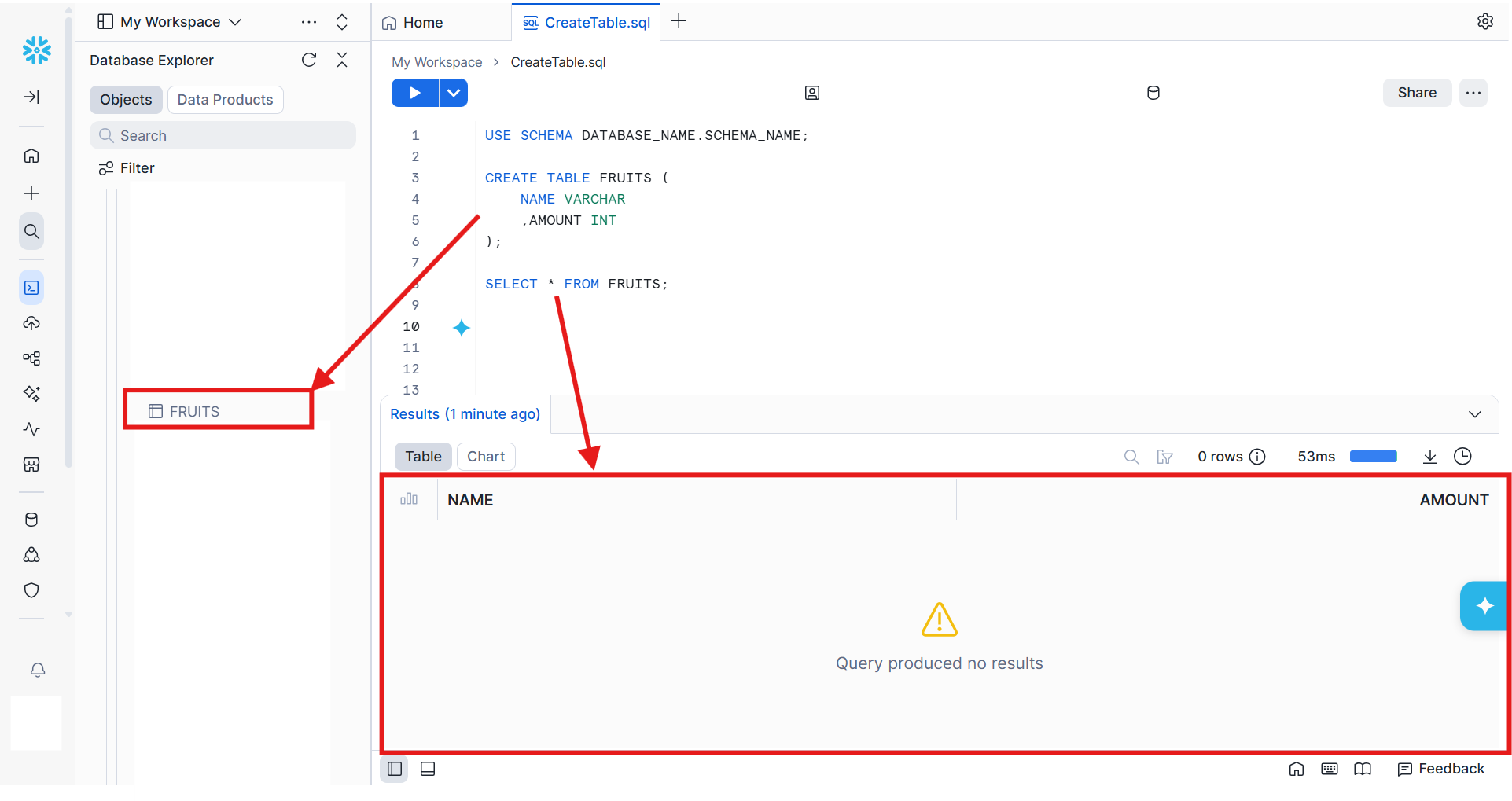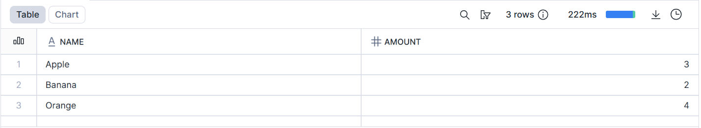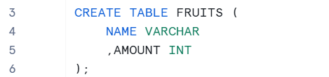 Below, I created a table named FRUITS with a column called NAME, which stores a string representing the fruit name (for example, 'Apple'), and a column called AMOUNT, which stores an integer representing how many of each fruit are in stock.