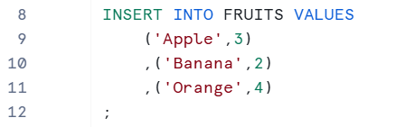Here, the COLUMN1_VALUE and COLUMN2_VALUE must match the datatype of the columns. You can see below that we inserted three rows of data into the FRUITS table. The fruit names 'Apple', 'Banana', and 'Orange' are stored in the NAME column, which accepts string values, while the numbers 3, 2, and 4 are stored in the AMOUNT column, which accepts integer values.