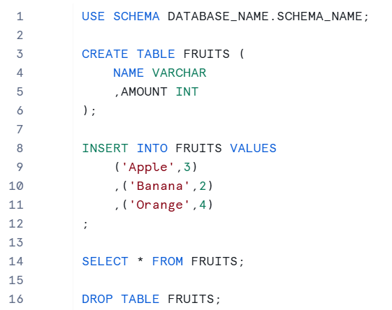The code above will drop the FRUITS table we just created, effectively removing it and almost resetting our footprint within the database and schema.
