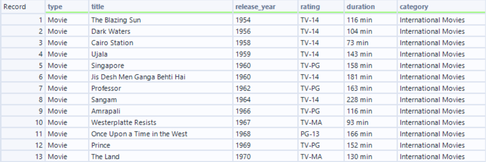 Your output should now contain a list of films with information on it's type, title, release year, rating, and duration, ordered by their release year and duration. Well done!