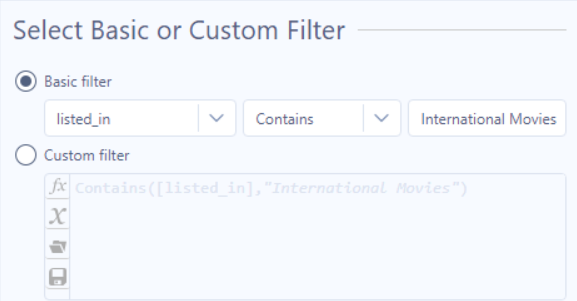 Since each cell contains multiple categories as one single string, we need to see if that string contains "International movies" and filter for those. Here's how we can set up our filter tool to achieve that: