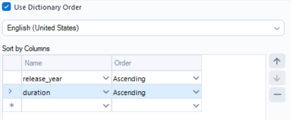 Then, select "duration", also ascending. Now when we have two or more films with the same release year, they will be sorted by their duration.