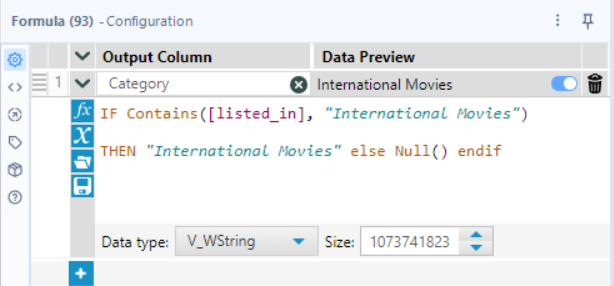 For this step, we need to create a new field called "Category". We can populate by using an IF statement, checking whether the "listed_in" field contains "International Movies" and, if it does, adding this string to our new Category field.