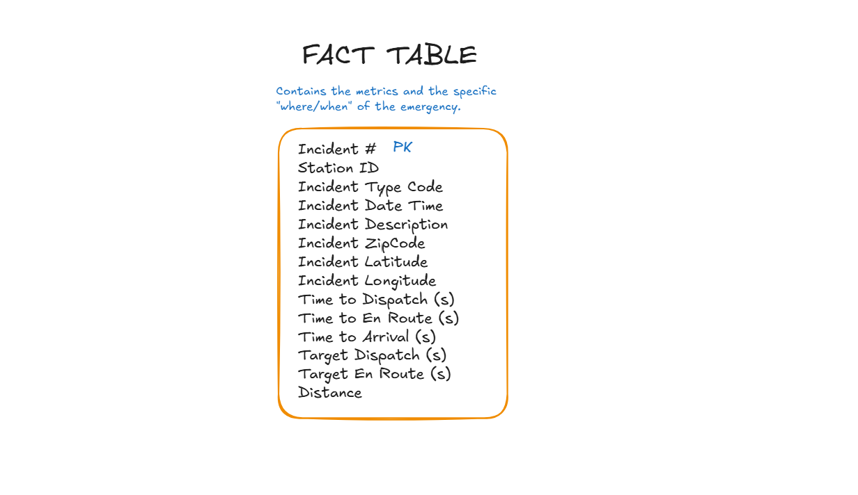 For example, fields like Time to Dispatch, Time to En Route, and Time to Arrival may remain in the fact table because they are direct measurements of the incident event.