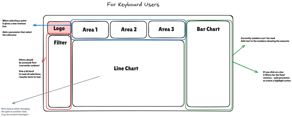 For my challenge today, I was tasked with making one of our existing dashboards on our internal Tableau Server fully accessible to a user navigating solely with a keyboard. How did it turn out… well unfortunately, I cannot share the initial dashboard or my final result due to privacy reasons (as this is some sensitive company data and I would like to keep my job 😅) but I have provided my designs and some mock up designs of the dashboard (minus the graphs).