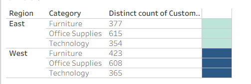 Using the color on the furthest right column, I highlighted a different calculation. Instead of counting customers at the Region → Category level, we want to calculate the distinct number of customers at the Region level only.
