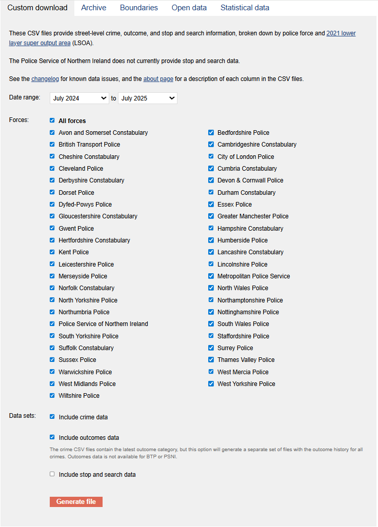 Step one was downloading the data from the Police UK website. This gave me both street-level crime data and outcome data.