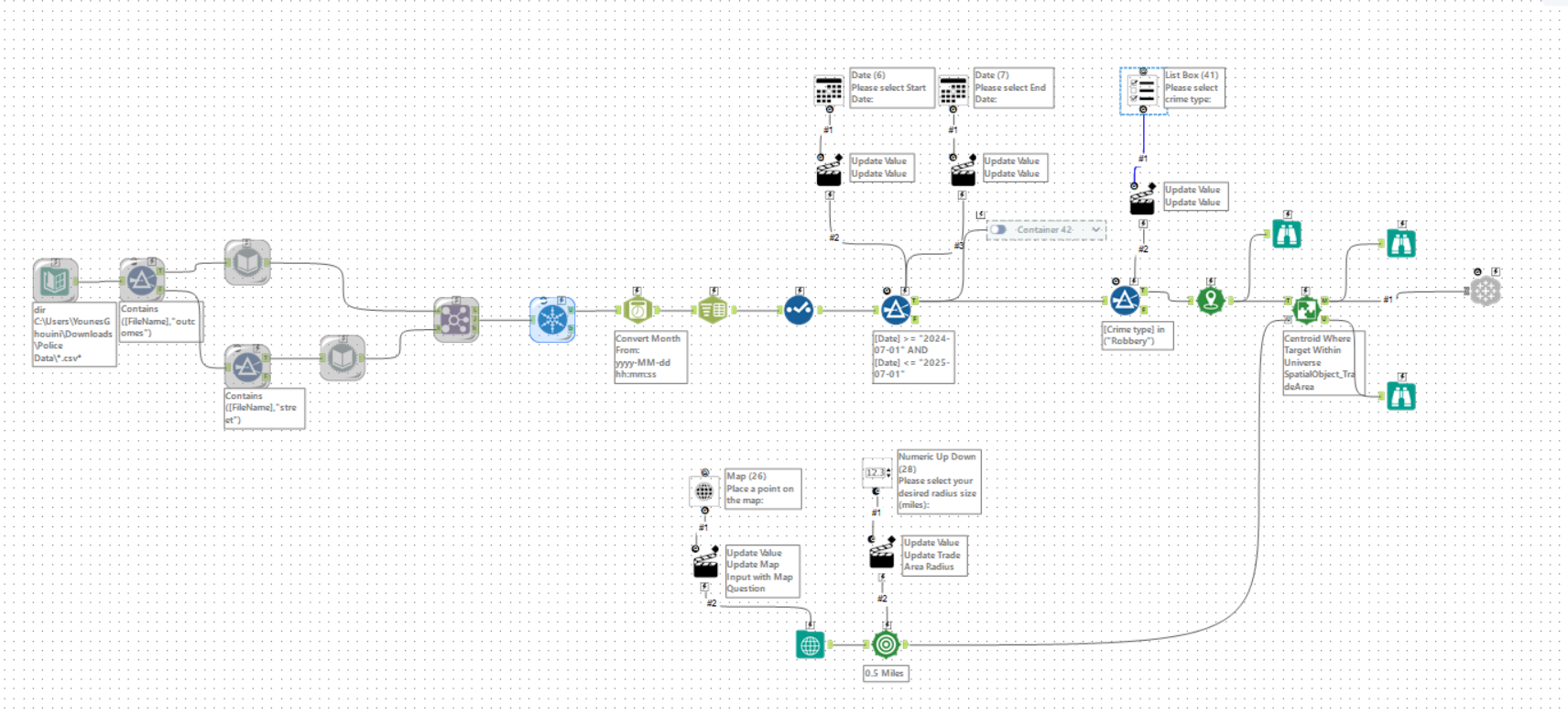 Step twelve added the spatial elements. Using the Create Points tool, I mapped out all the crimes. Then with the Spatial Match tool, I connected it to a map and radius tool so the user could pin a specific location and type in their desired radius.