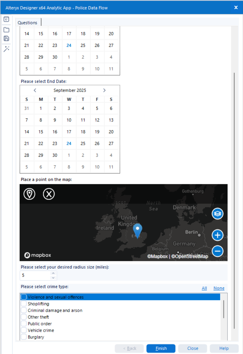 For day three, DS52 were tasked with analysing data on UK Street Crimes between July 2024 and July 2025. The challenge was to use this data to build an Alteryx App that would allow the user to pick a specific date range, crime category and area (either using a map interface tool or by typing in a postcode). The app would then update a data source that could be pushed to our Tableau Server, Power BI workspace or even Tableau Public via Google Sheets.