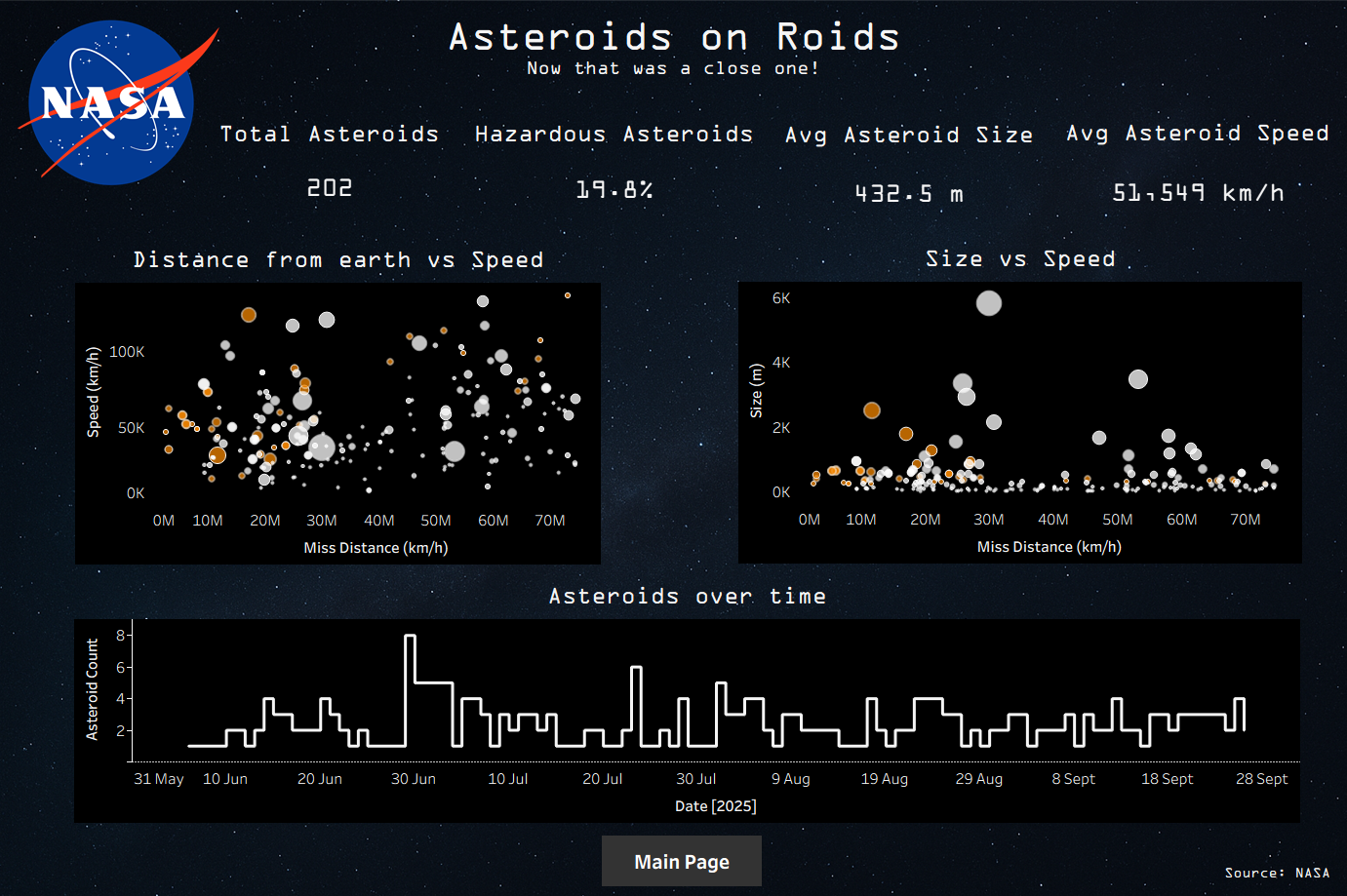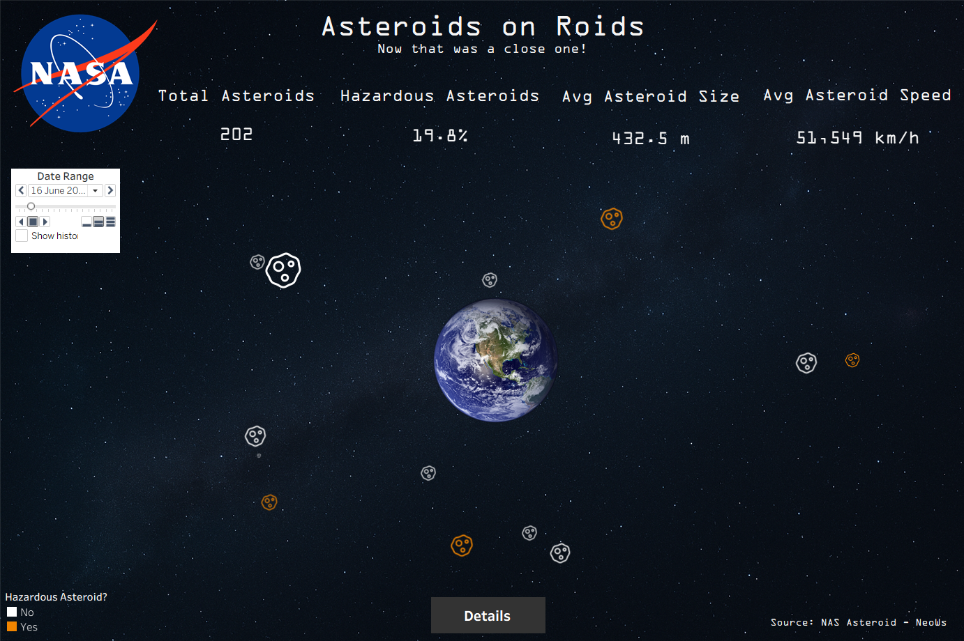 The dashboard shows near Earth asteroids observed over time, with a timeline from when we started at TIL to the day of publication.