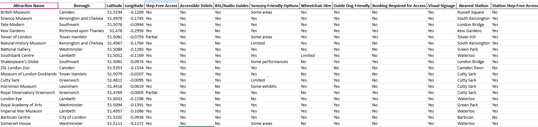 Data: The London Accessibility Dataset — Attractions sheet (access features, booking policies, etc.)